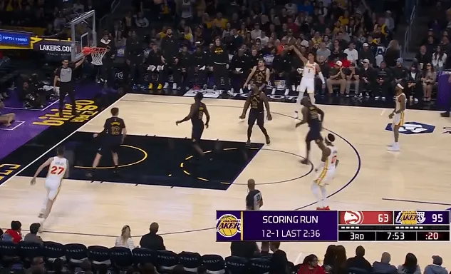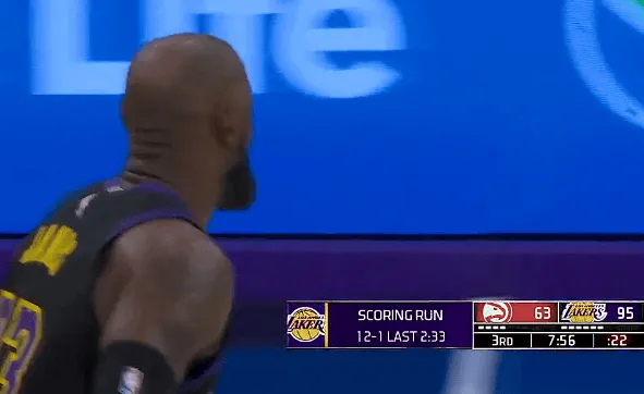 第三节比赛中,詹姆斯三分也投进,湖人下半场轰出12-1领先老鹰32分。